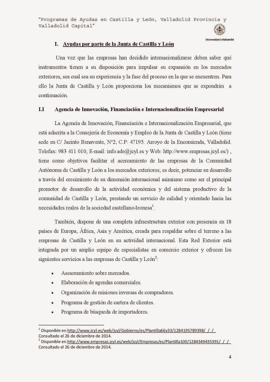 Programa de Ayudas al Comercio Exterior actualizadas hasta el 01 de Enero de 2015 proporcionadas por la Castilla y León (Junta de Castilla y León y empresas privadas), la provincia de Valladolid (a través de la Diputación Provincial de Valladolid) y el Ayuntamiento de Valladolid.